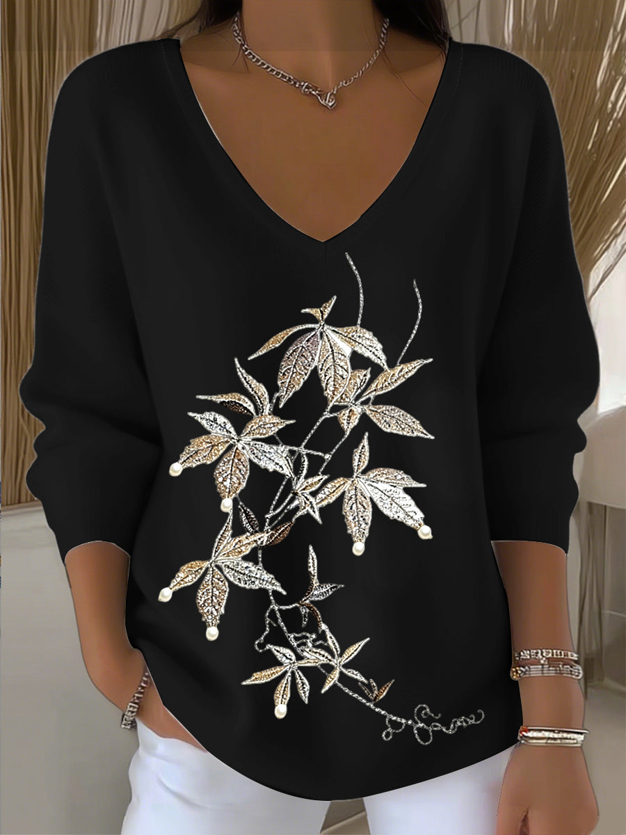 Czarny sweter damski w europejskim stylu z dekoltem w szpic z wykwintnym i atmosferycznym haftem liści, modny i wygodny, pierwszy wybór na zimę