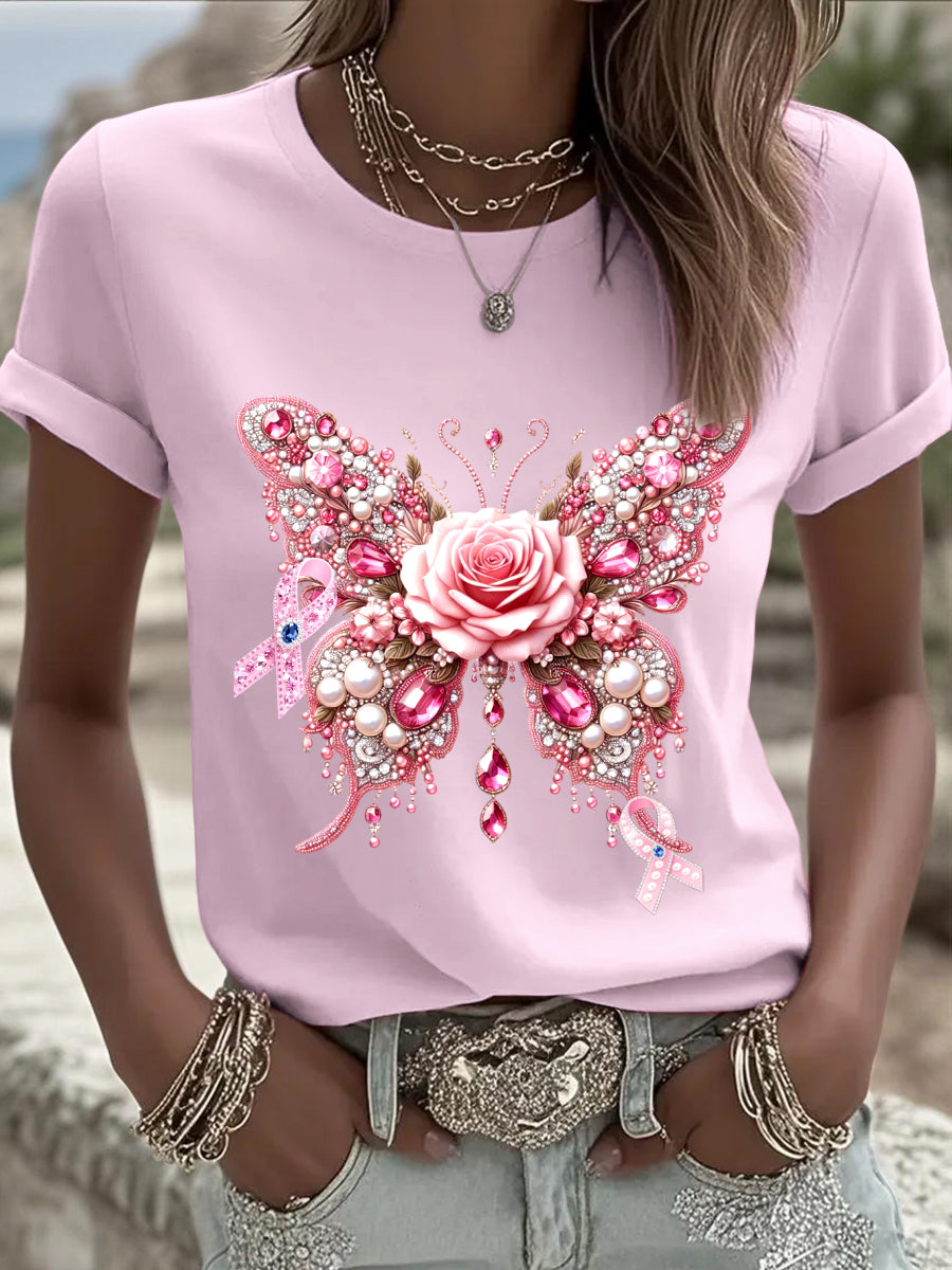 Damska diamentowa koszulka z motylem i wstążką w kolorze jasnoróżowym z okrągłym dekoltem z krótkim rękawem