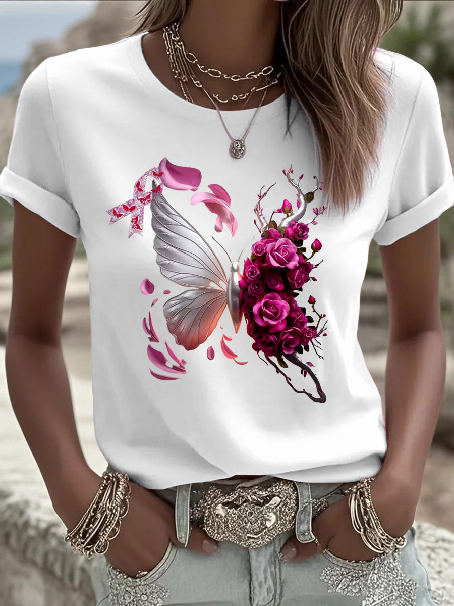Damska nastrojowa i prosta różowa wstążka i motyl z nadrukiem swobodna koszula z krótkim rękawem z okrągłym dekoltem