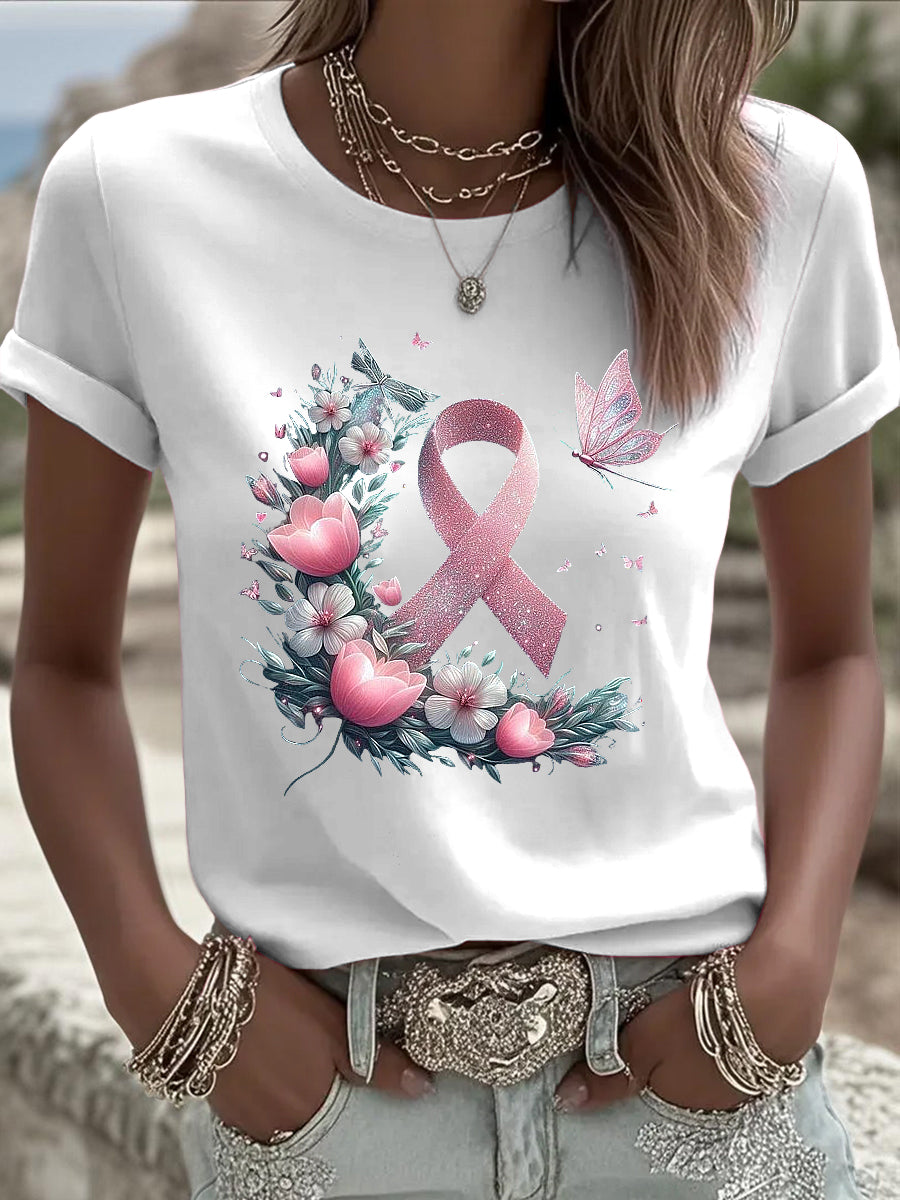 Damska wstążka z rakiem piersi motyl z kwiatowym nadrukiem Casual T-Shirt