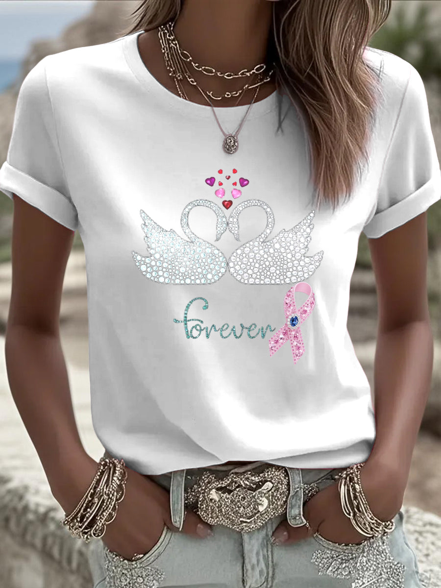 Damski diamentowy łabędź i wstążka Biały okrągły dekolt z krótkim rękawem