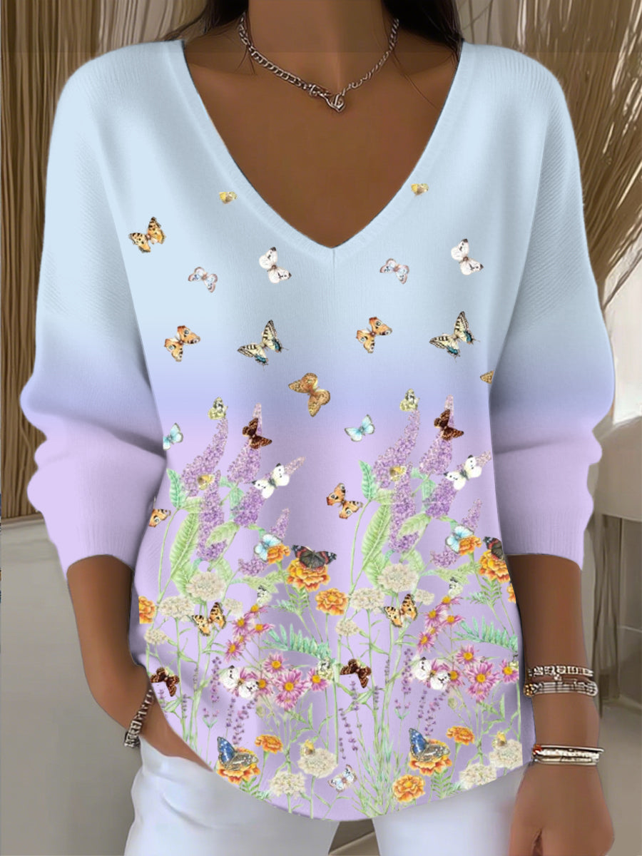Damski marzycielski niebiesko-fioletowy sweter z dekoltem w szpic i kwiatowym nadrukiem