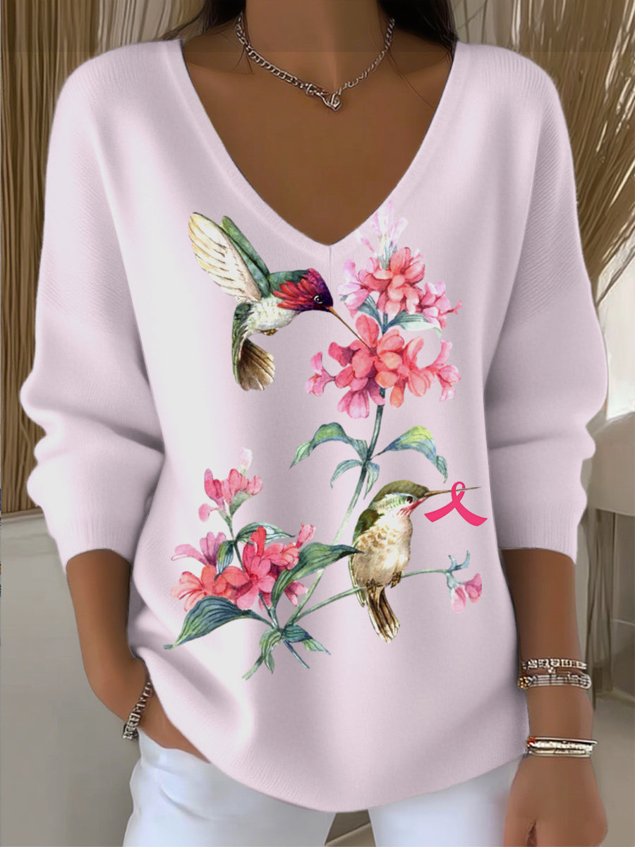 Damski minimalistyczny koliber haftowany jasnoróżowy sweter z dekoltem w szpic