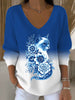 Damski oszałamiający niebiesko-biały sweter z dekoltem w szpic z niebieskim kotem i kwiatowym wzorem