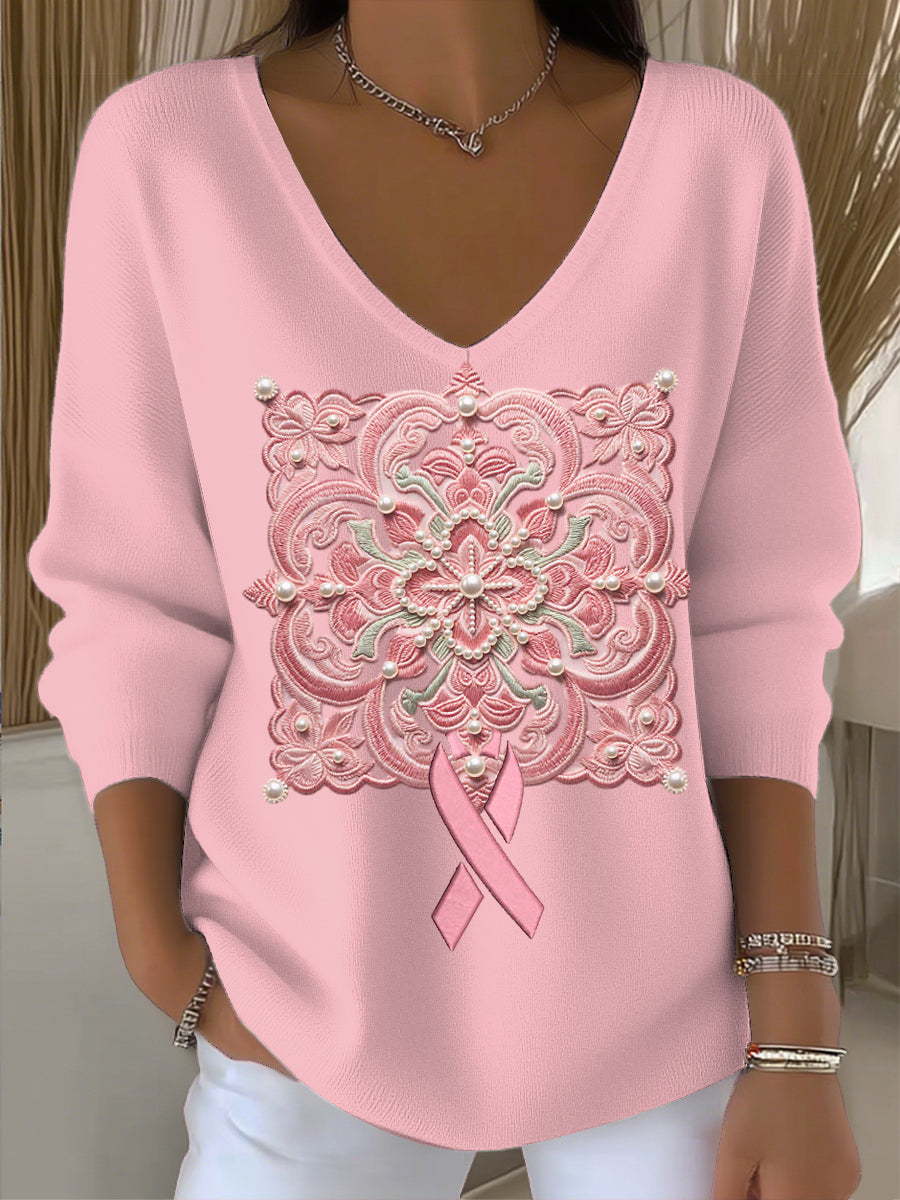 Damski różowy sweter z kwiatową wstążką na co dzień