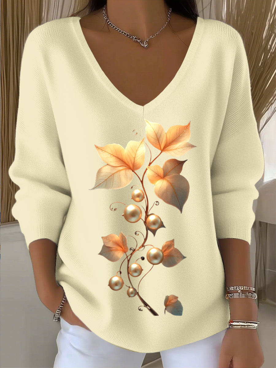 Damski sweter w stylu europejskim w kolorze jasnożółtym z dekoltem w szpic, ozdobiony prostym haftem kwiatowym, prosty i klimatyczny, prezentujący styl w codziennym stroju