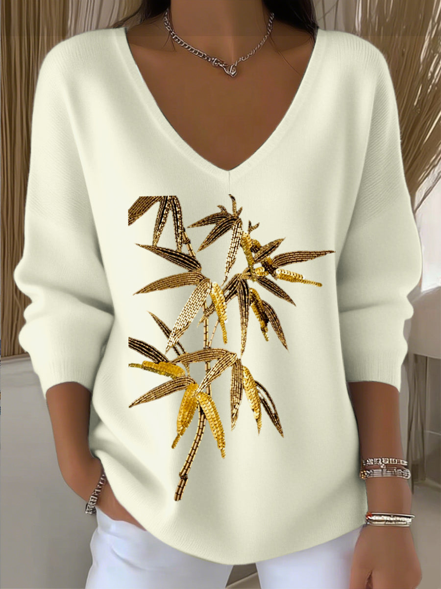 Damski sweter w stylu europejskim w kolorze jasnożółtym z dekoltem w szpic, ozdobiony wykwintnym haftem liści, prosty i modny, prezentujący styl w codziennym noszeniu