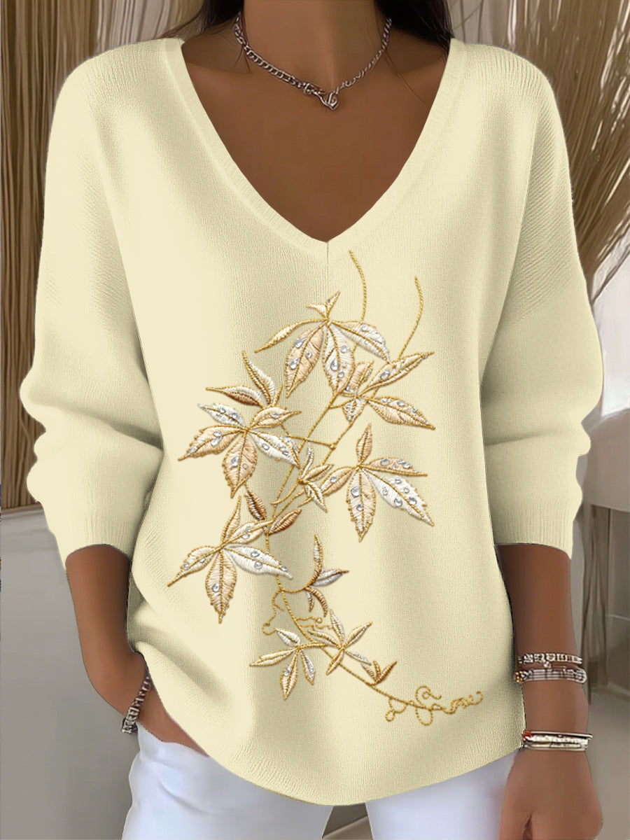 Damski sweter w stylu europejskim w kolorze jasnożółtym z dekoltem w szpic, w połączeniu z efektownym haftem liści, o modnym temperamencie, nadaje się do noszenia na co dzień