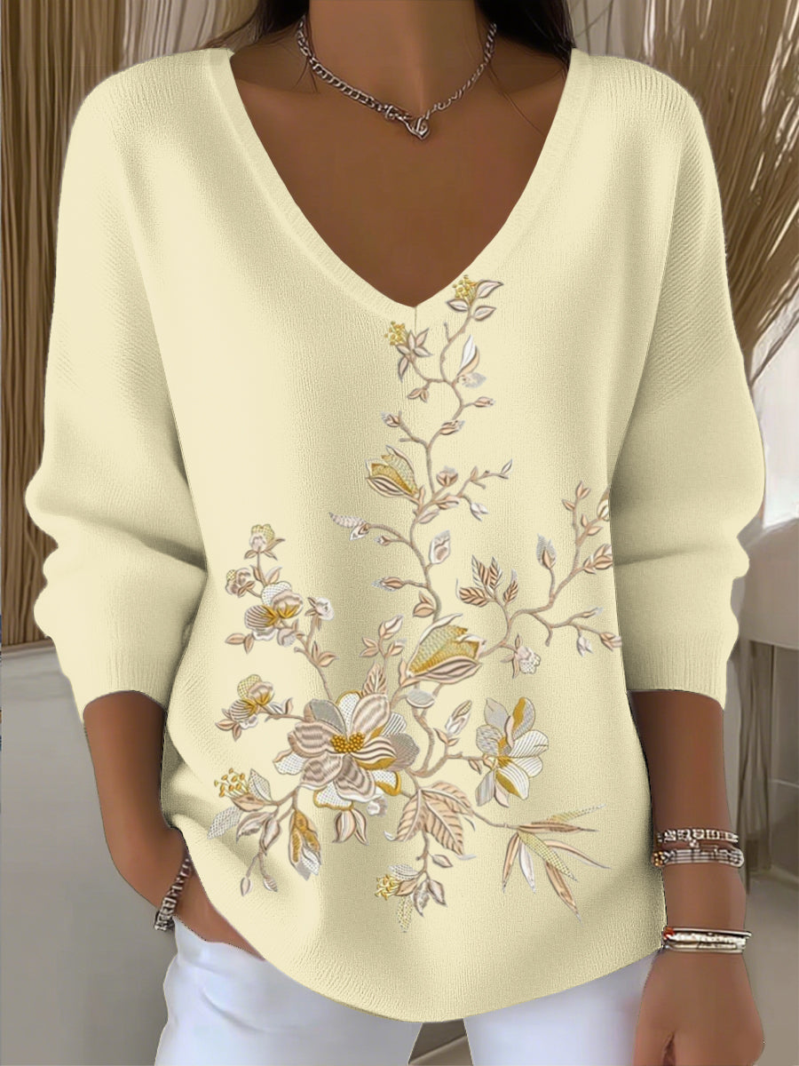 Damski sweter z żółtym haftem kwiatowym z dekoltem w szpic
