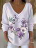 Damski temperament fioletowy kwiatowy haft motylkowy sweter z dekoltem w szpic