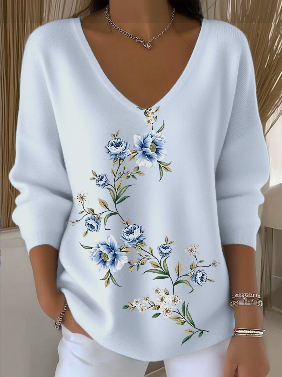Damski temperament kwiatowy haft niebieski sweter z dekoltem w szpic