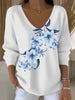 Damski temperament niebieski duży kwiat haftowany czysty biały sweter z dekoltem w szpic