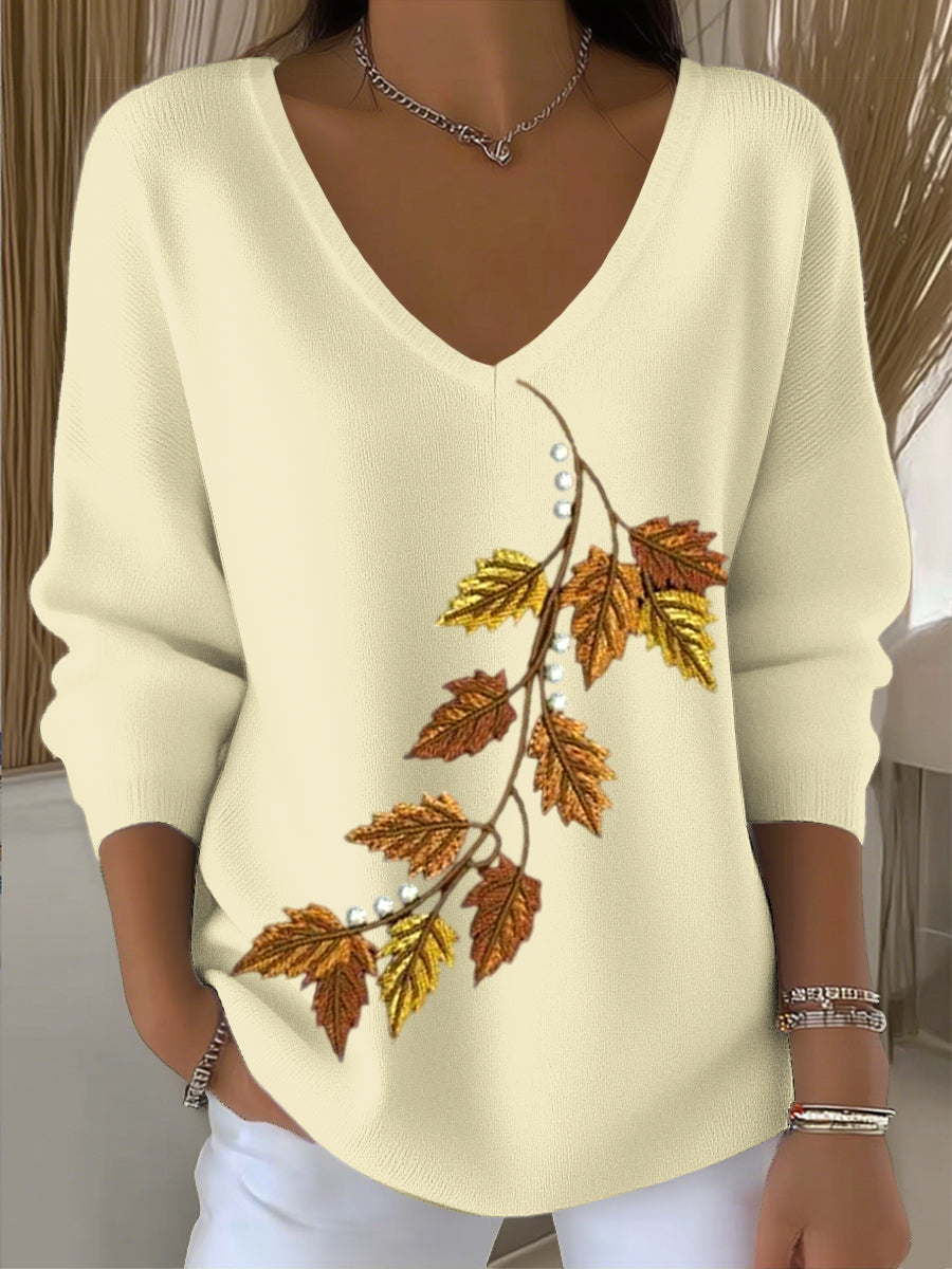 Damski w europejskim stylu jasnożółty sweter z dekoltem w szpic z wykwintnym haftem liści, modny i wygodny, nadaje się do noszenia na co dzień