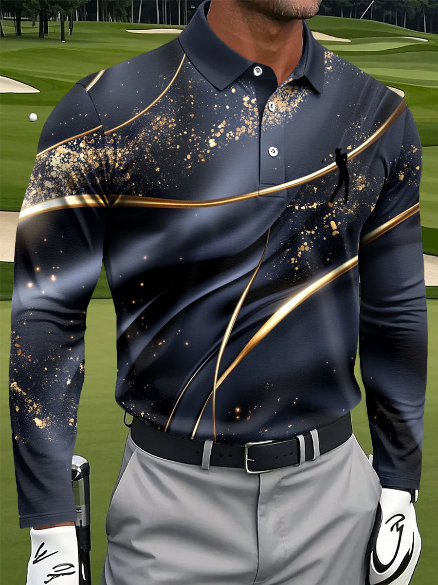 Męska koszulka polo z długim rękawem w stylu retro w abstrakcyjne paski z teksturowanym nadrukiem