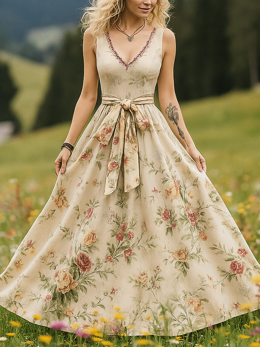 Retro wiejska sztuka kwiatowa z nadrukiem Vintage dekolt w szpic bez rękawów wygodna sukienka maxi