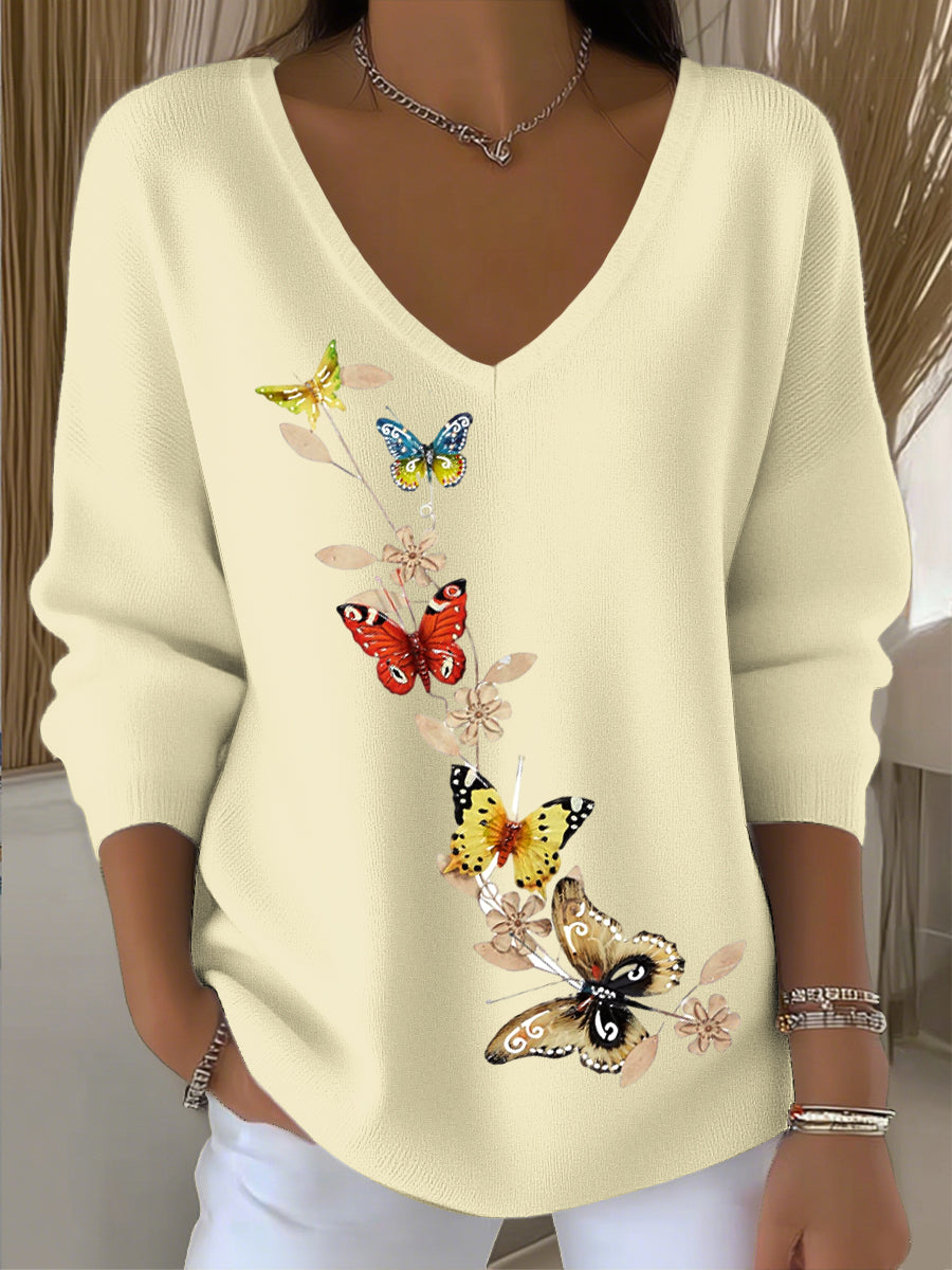 Świeży beżowy sweter damski z dekoltem w szpic z kolorowym motylem i kwiatowymi wzorami