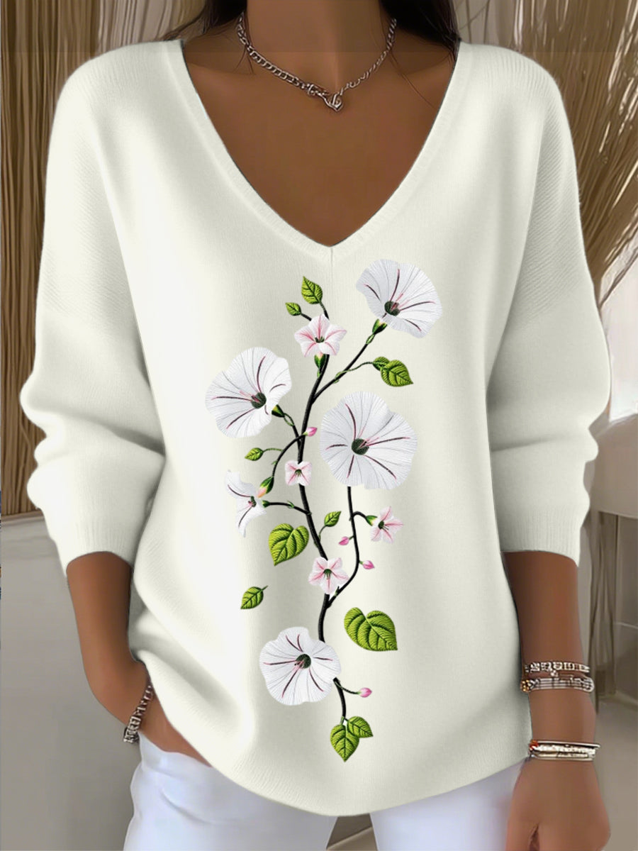 Świeży biały sweter damski z dekoltem w szpic z kwiatowym haftem Morning Glory