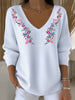 Świeży jasnoniebieski sweter damski z dekoltem w szpic i różowo-niebieski kwiatowy i motylkowy haft na dekolcie w szpic