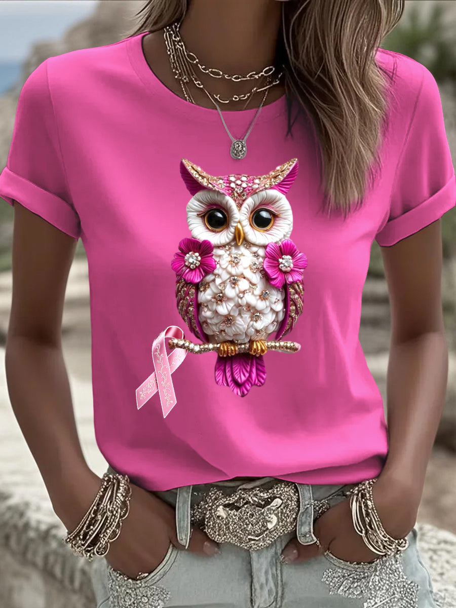 Urocza damska sowa i wstążka z nadrukiem różana czerwona koszula z okrągłym dekoltem z krótkim rękawem